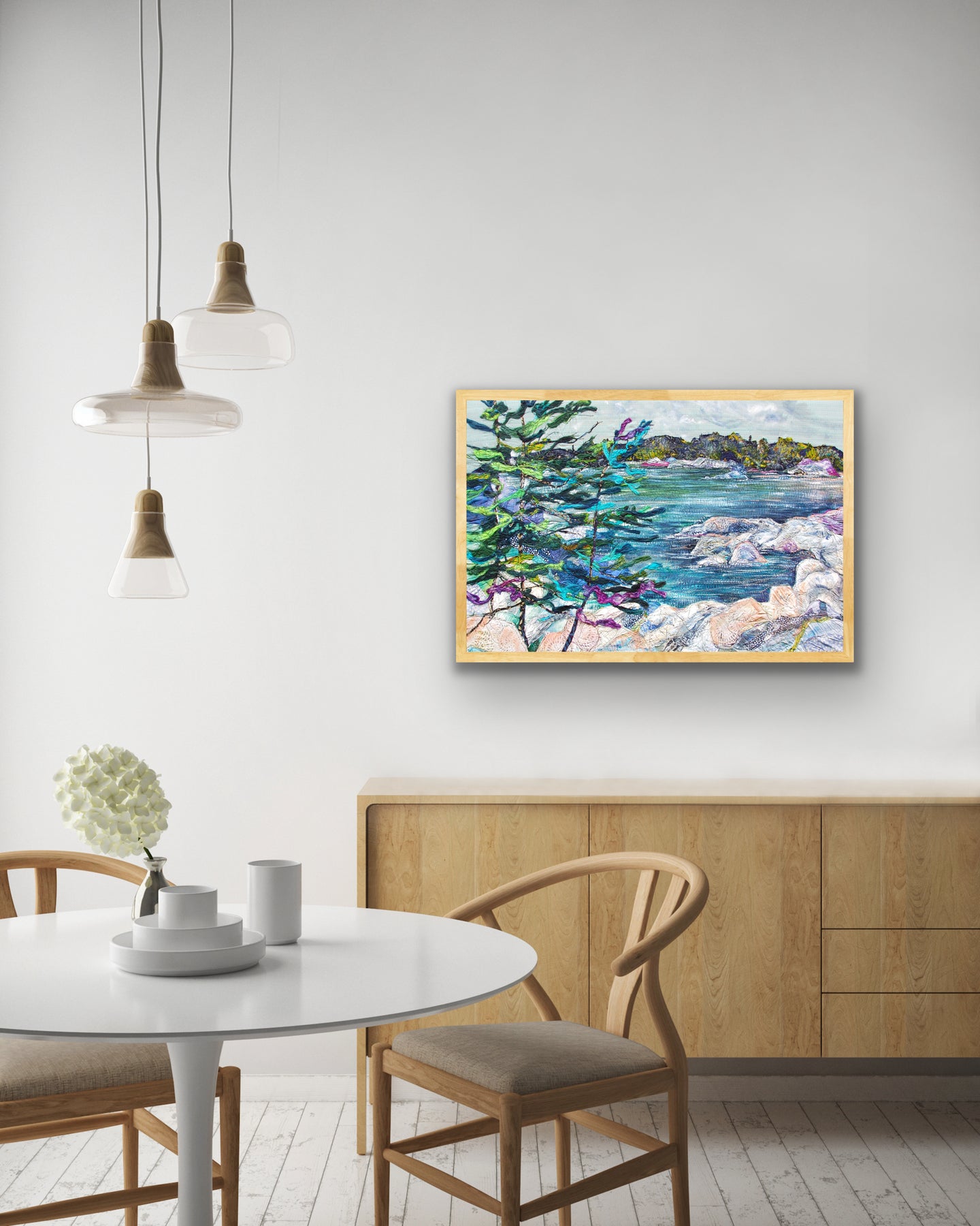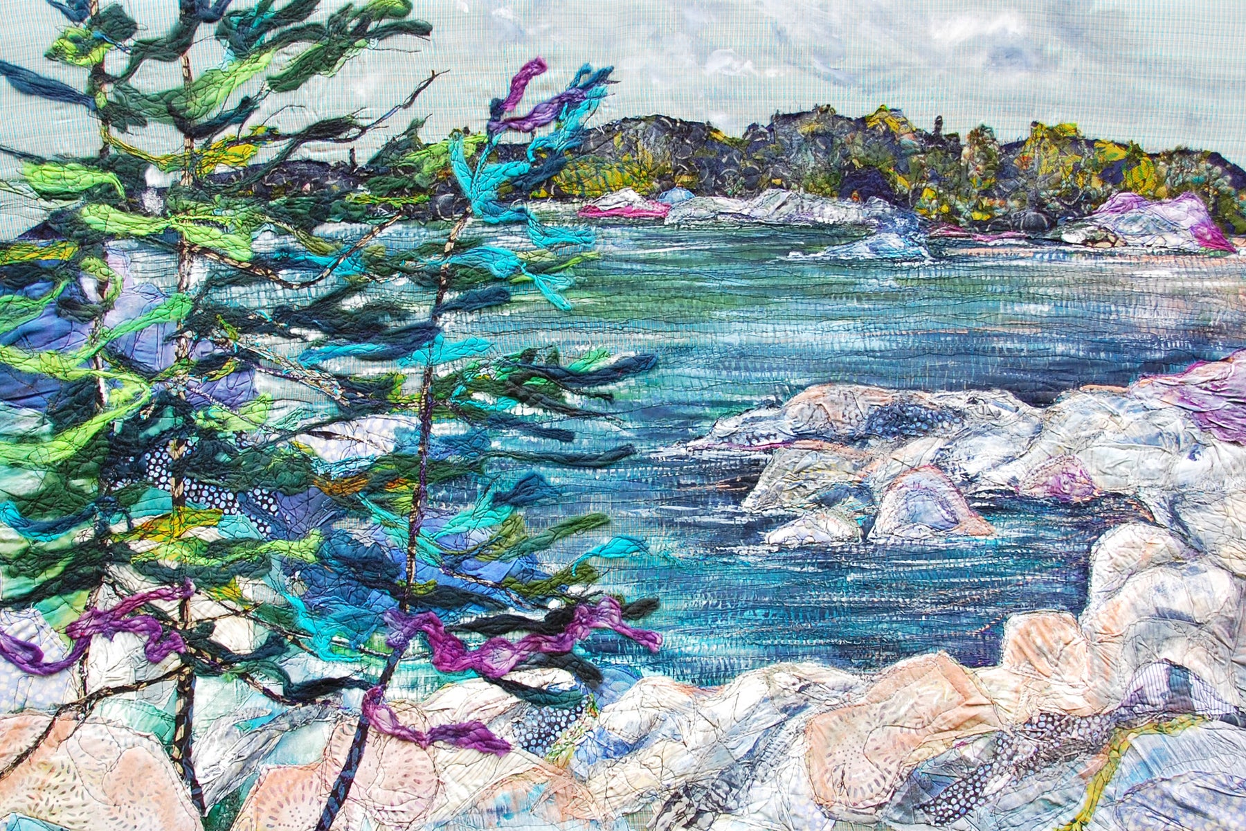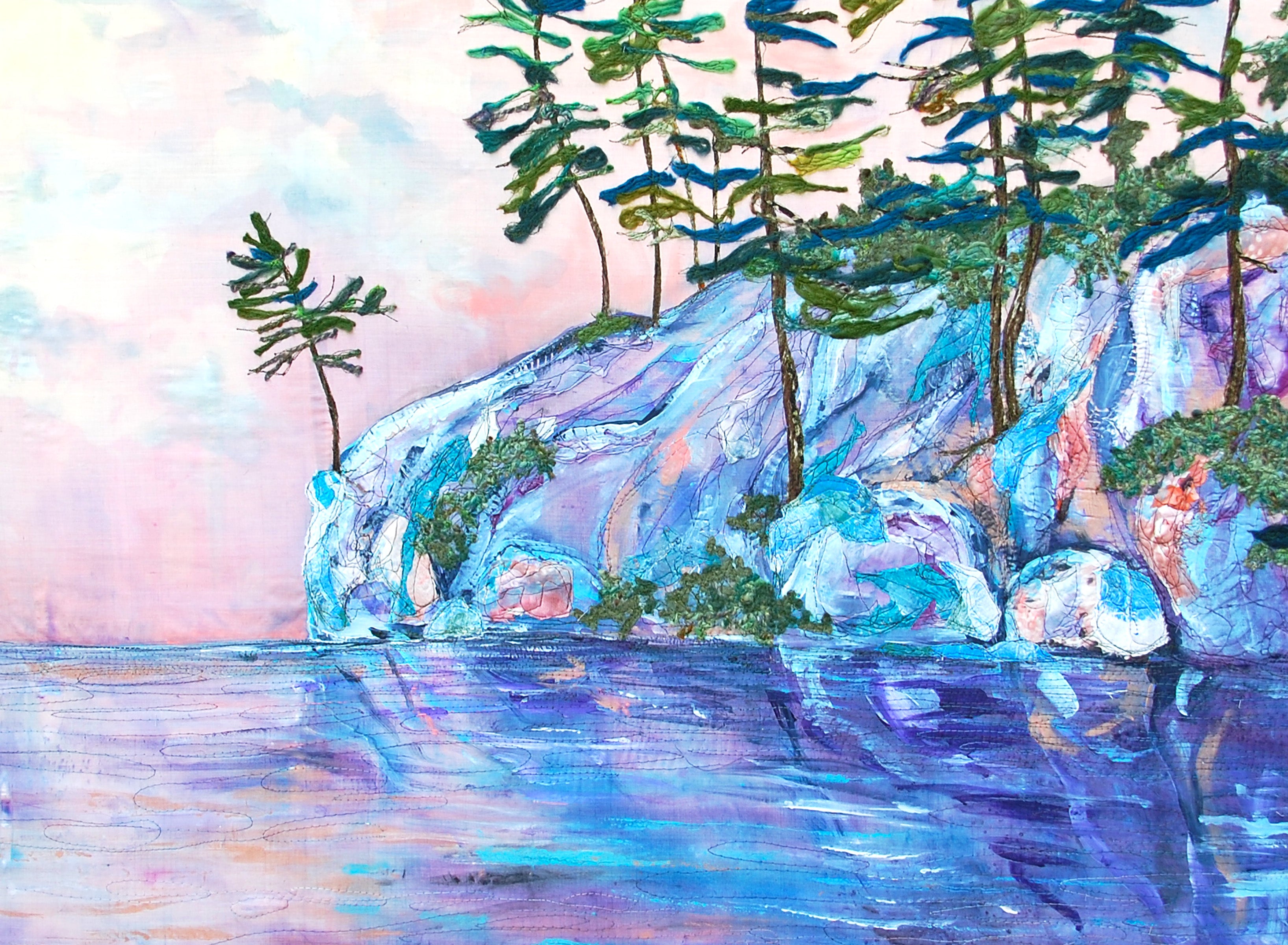 This piece captures the dramatic beauty of Georgian Bay, where the deep blue waters meet the rugged pink granite rocks of the islands. Inspired by this striking contrast, the artwork features rich, textured layers of silk, cotton and wool . The interplay of these two strikingly different colours creates a dynamic and captivating visual experience, drawing viewers into the natural splendour and raw beauty of this iconic landscape.