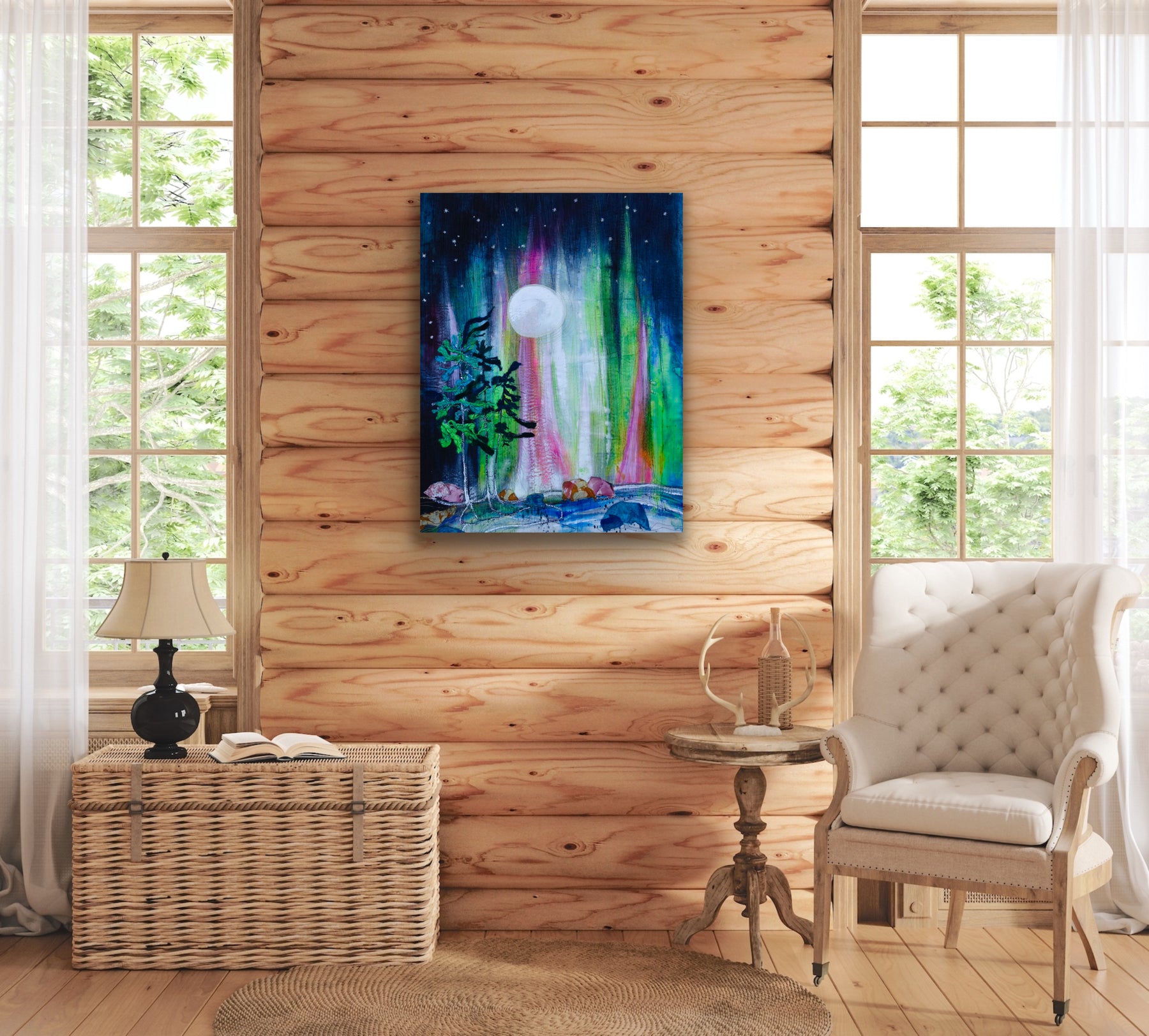 Light lifts from the earth, climbing toward the night sky in quiet arcs. White pines reach into the glow, their forms soft against the luminous ascent. The lake below gathers the movement, and in that delicate unfolding, the world feels both awake and hushed, as if holding its breath in awe.