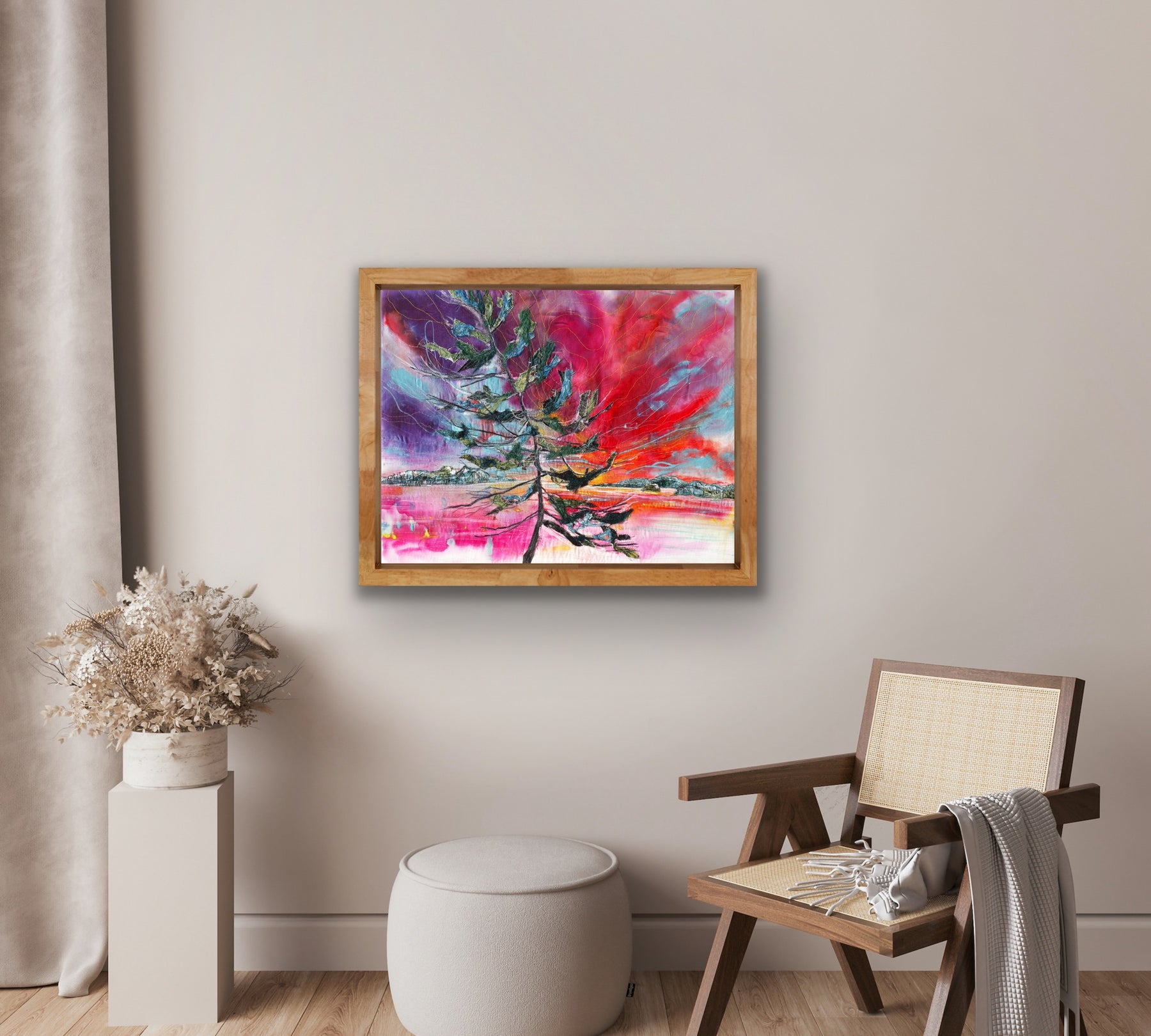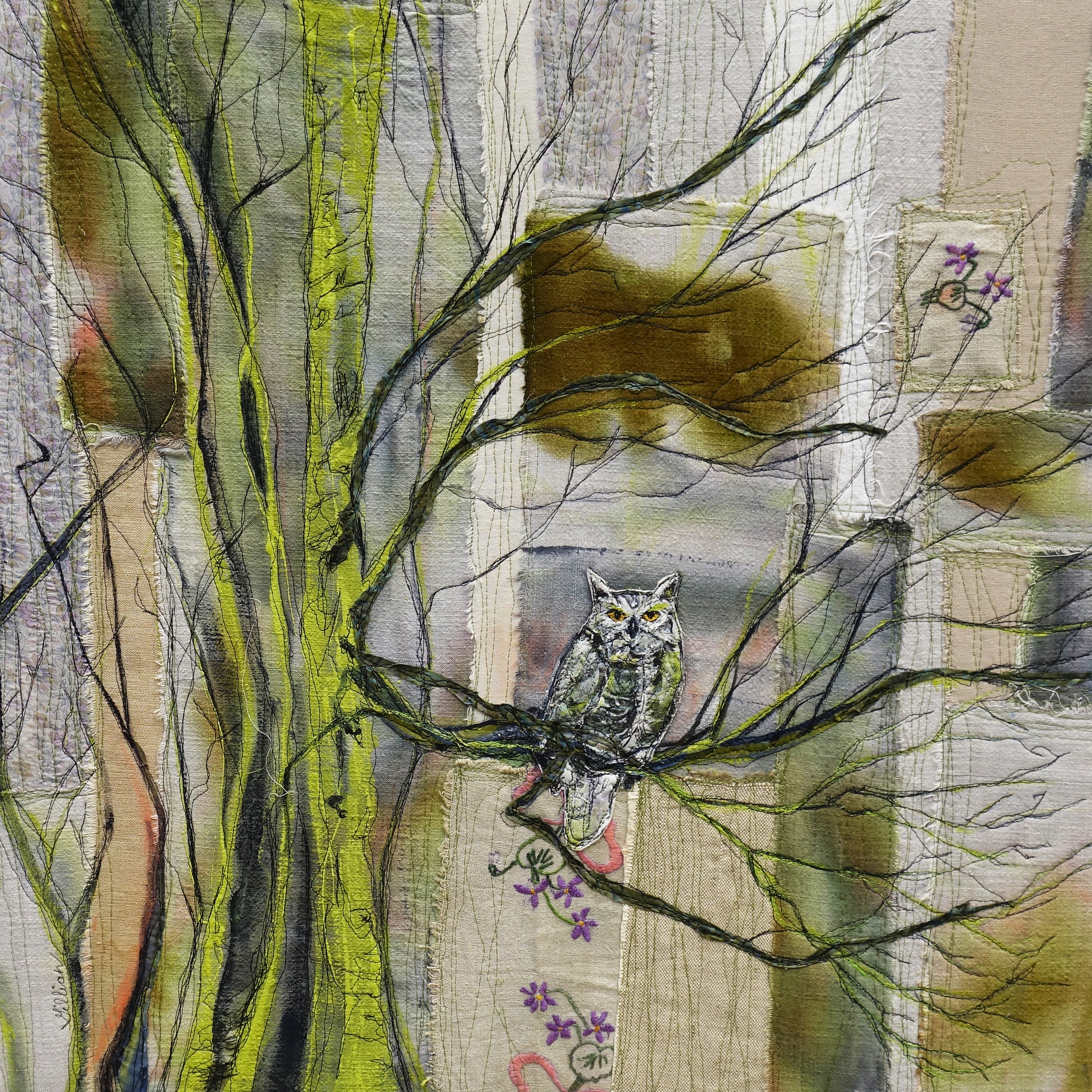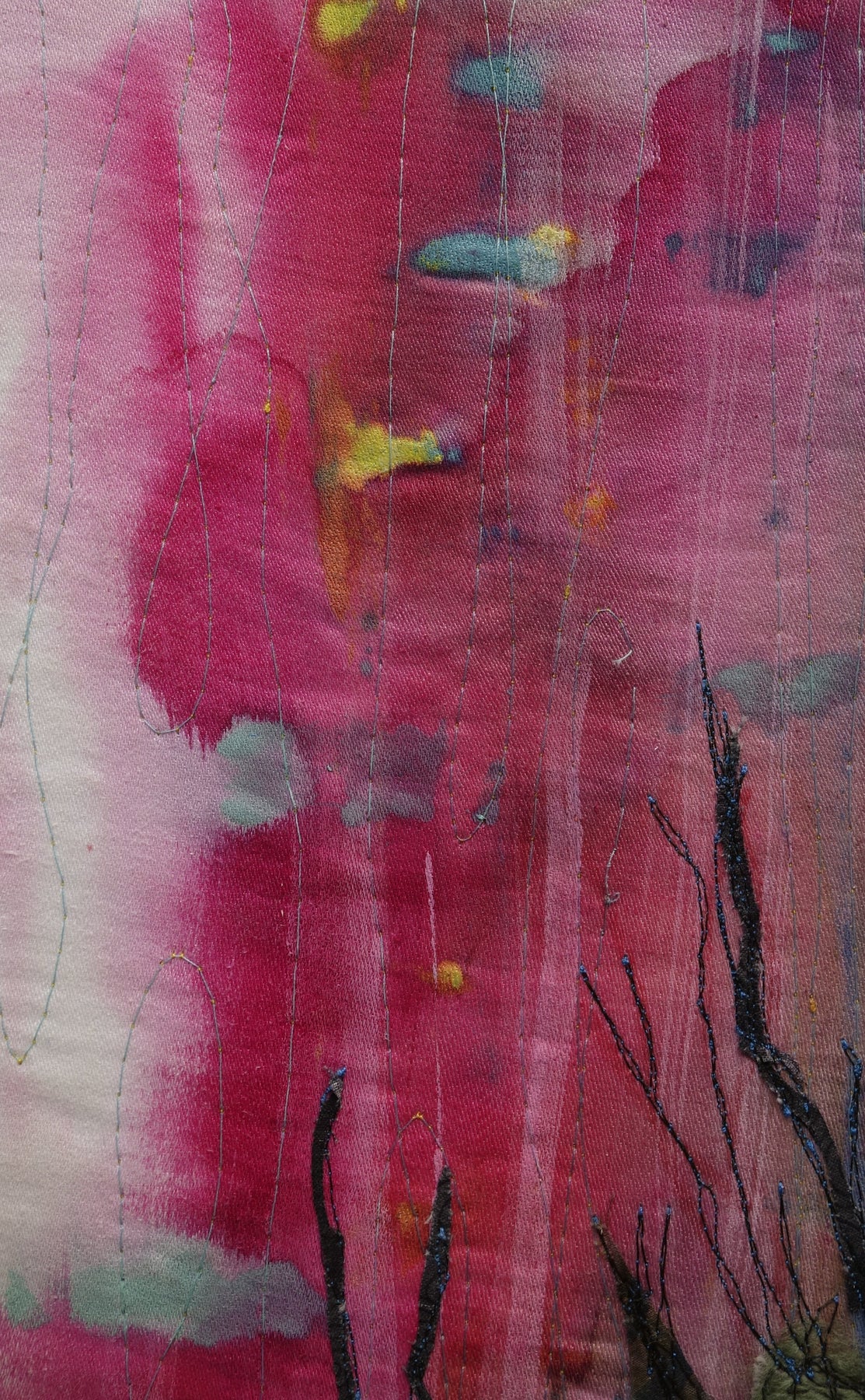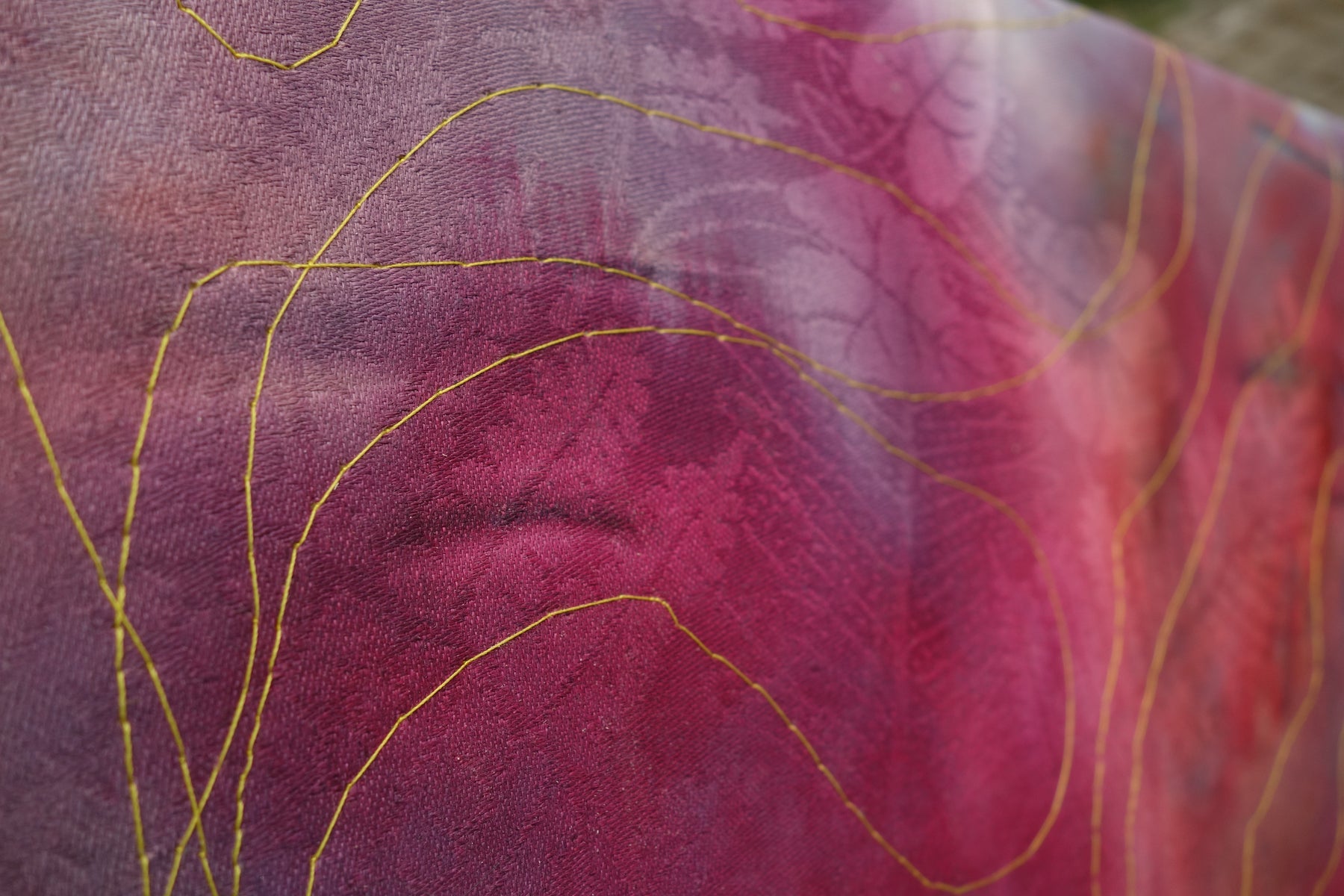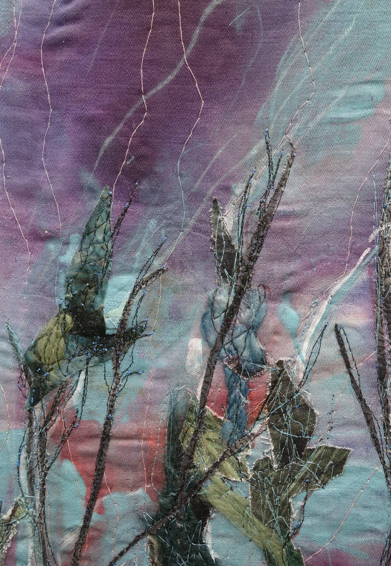 Textile art, machine and hand-stitched, with merino wool on a hand-dyed linen, up-cycled tablecloth