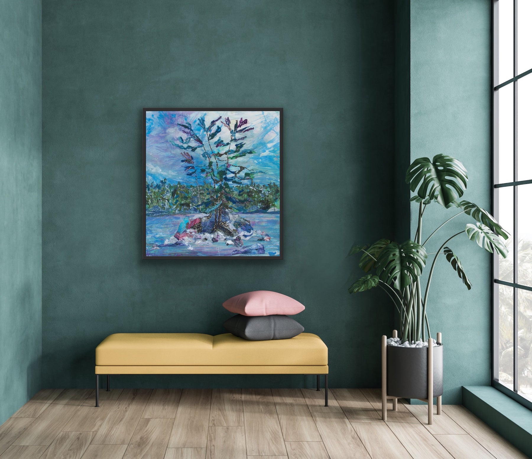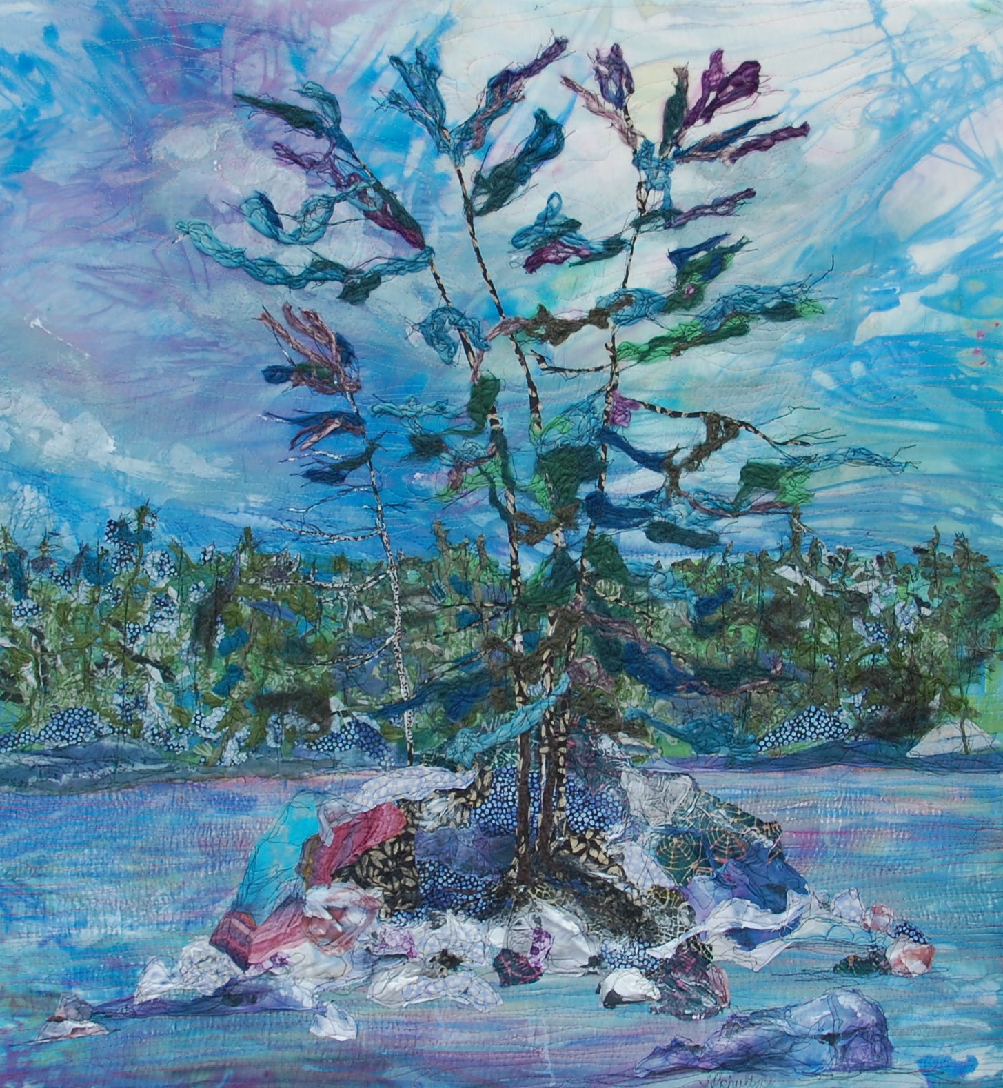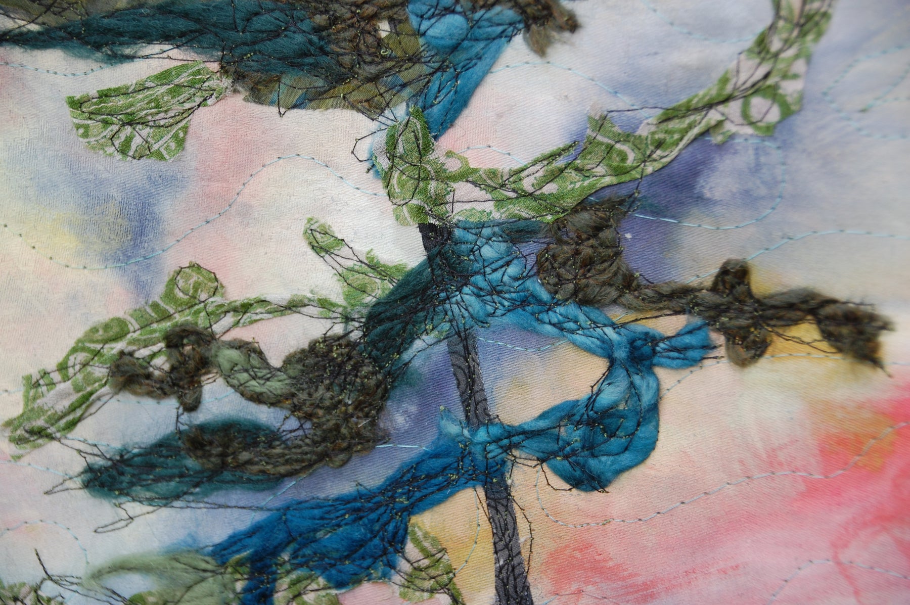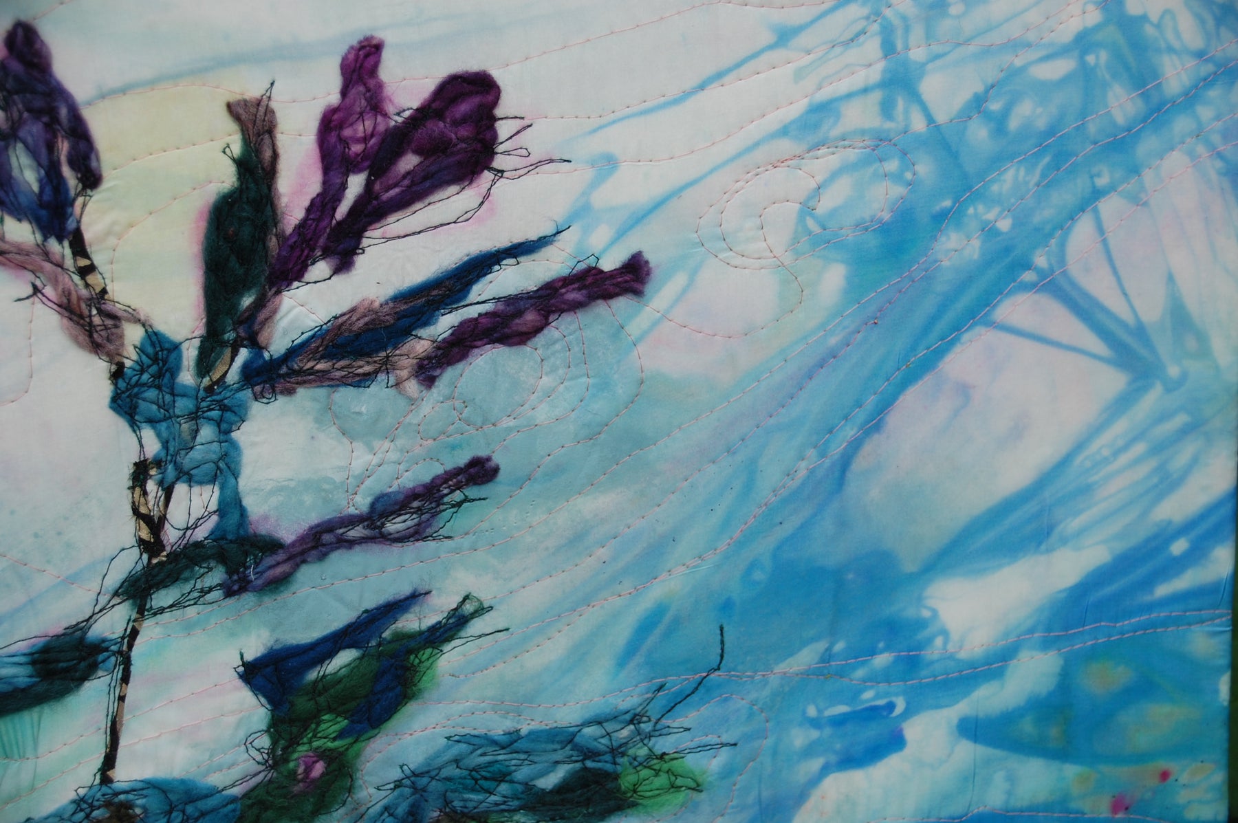 Textile art, machine and hand-stitched, with merino wool on a hand-dyed pure silk sky
