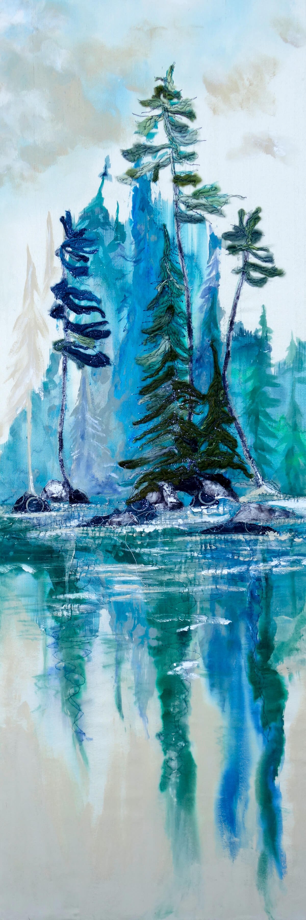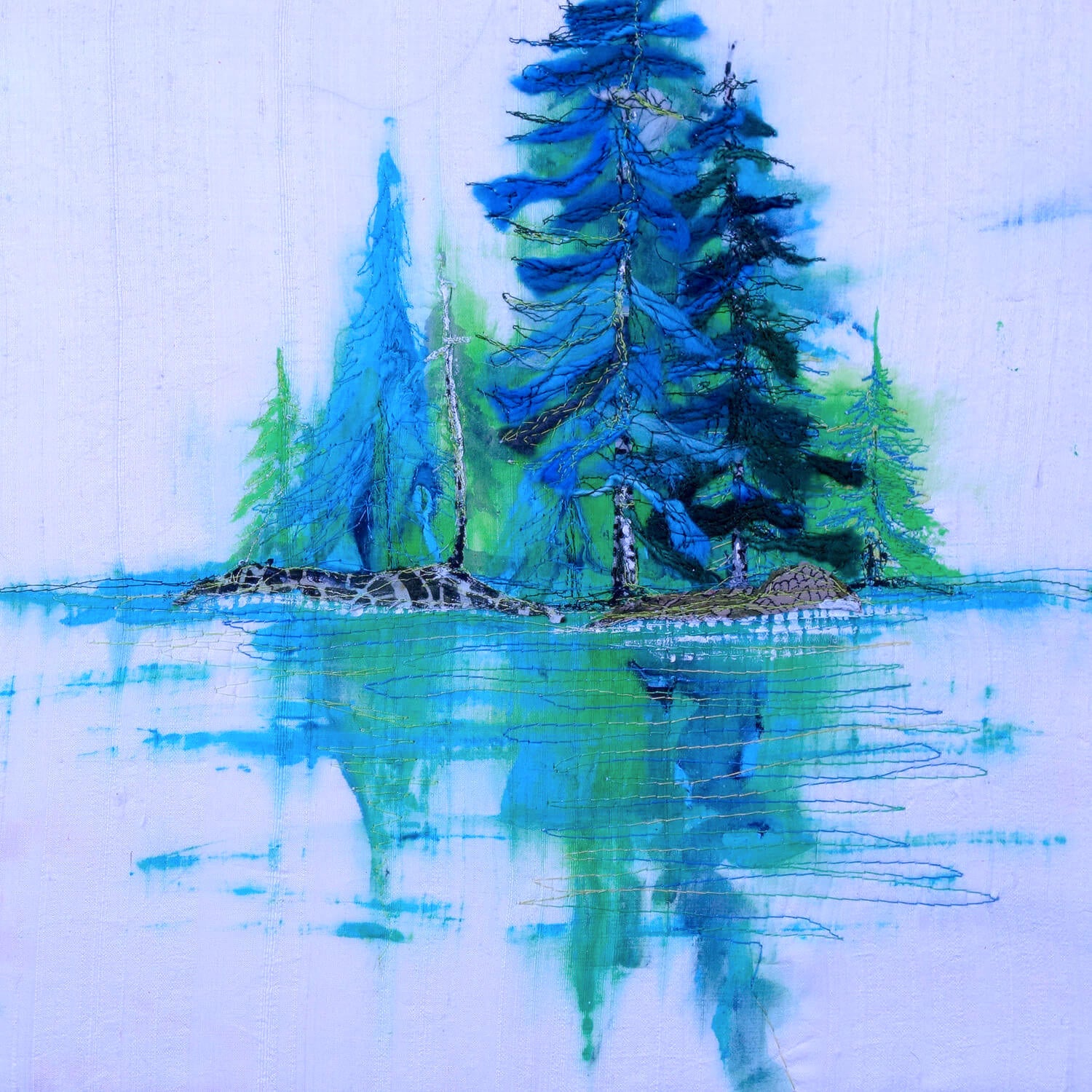 On pale silk, the faintest traces of blue and green trees gather like a memory of water. Everything is softened, distilled, almost disappearing — a moment held just before it fades.