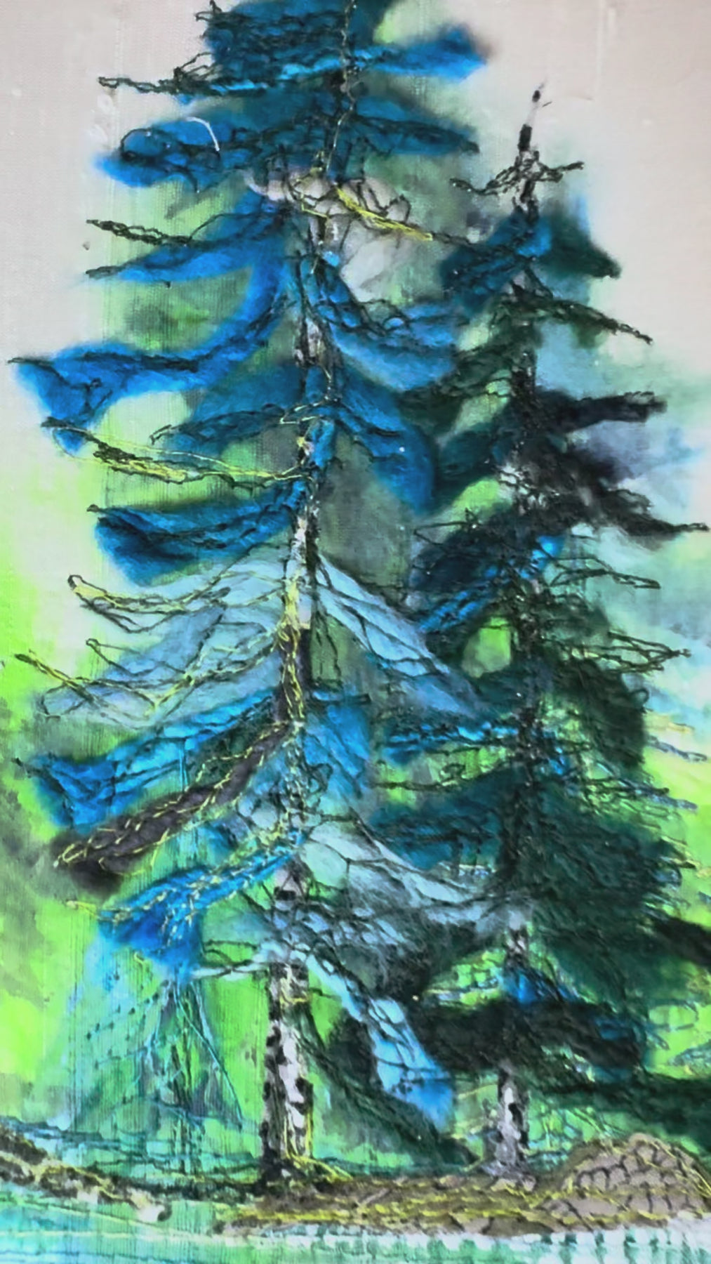 Medium: Hand painted on dupioni silk with merino wool and fabric, machine stitched