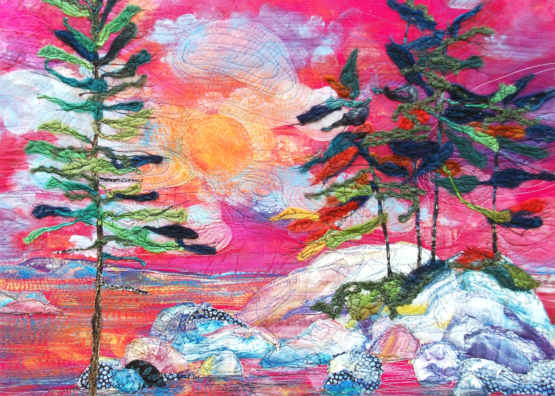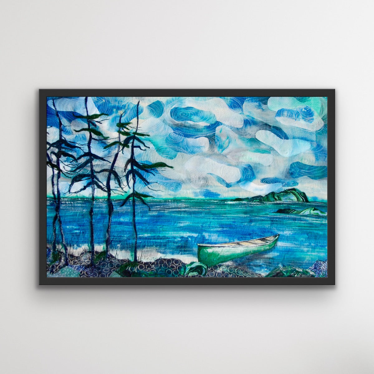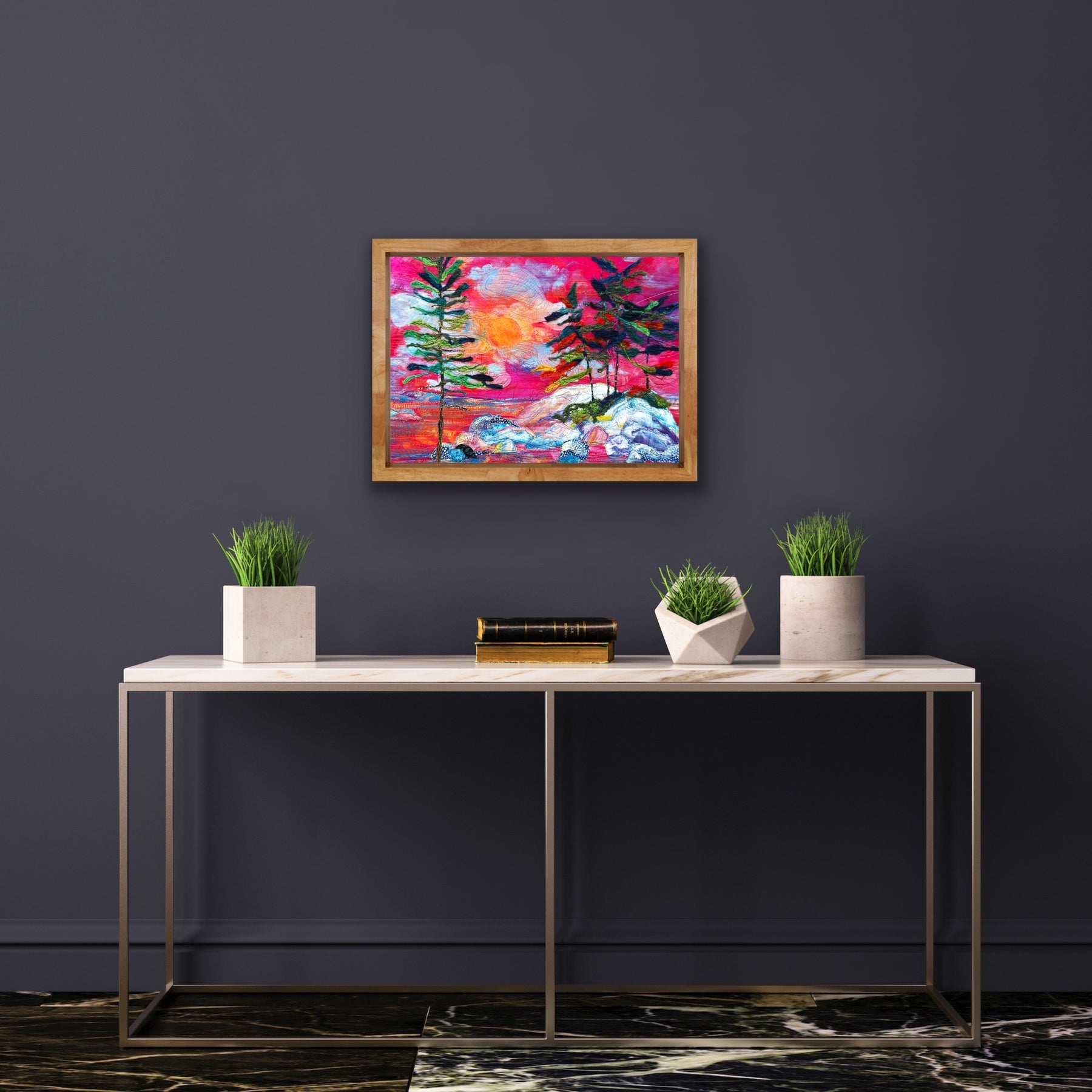 Beneath this celestial display, the rugged shoreline is illuminated, its rocky contours highlighted by the sun's final, gentle rays. The interplay of light and shadow on the rocks adds a dynamic quality, evoking the timeless and ever-changing nature of the landscape. This piece is a celebration of nature's fleeting yet eternal moments. It invites viewers to pause and immerse themselves in the quiet beauty of the setting sun, to reflect on the delicate balance between light and shadow, and to appreciate the reverence of nature's impermanence.