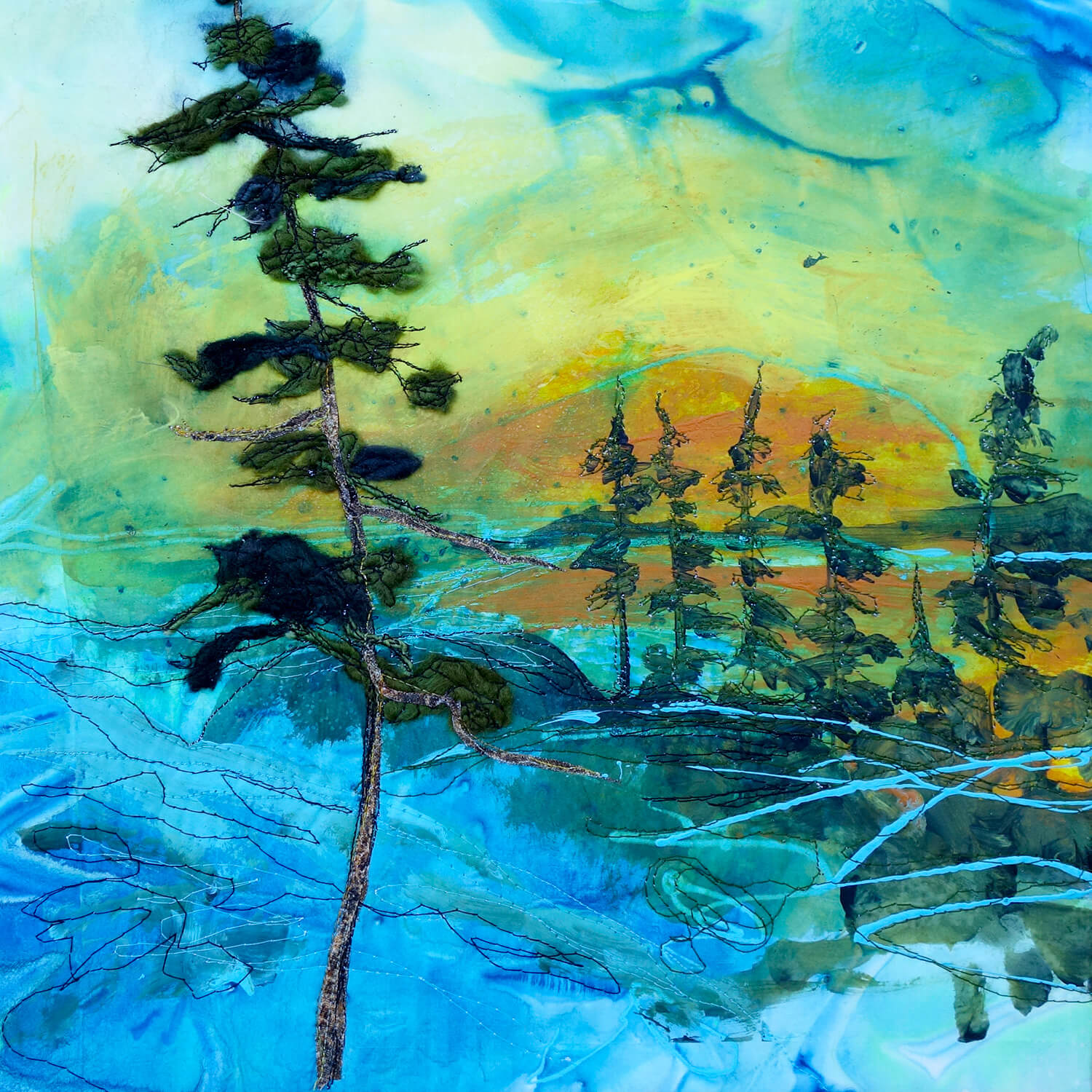 Under a sky washed in blue, the conifers stand quietly, as if listening to the pale light that moves among them. Wisps of colour drift through the branches—soft, wandering, sure of their own ease. In this gentle brightness, the trees seem to breathe with the sky itself, unhurried, wholly present.