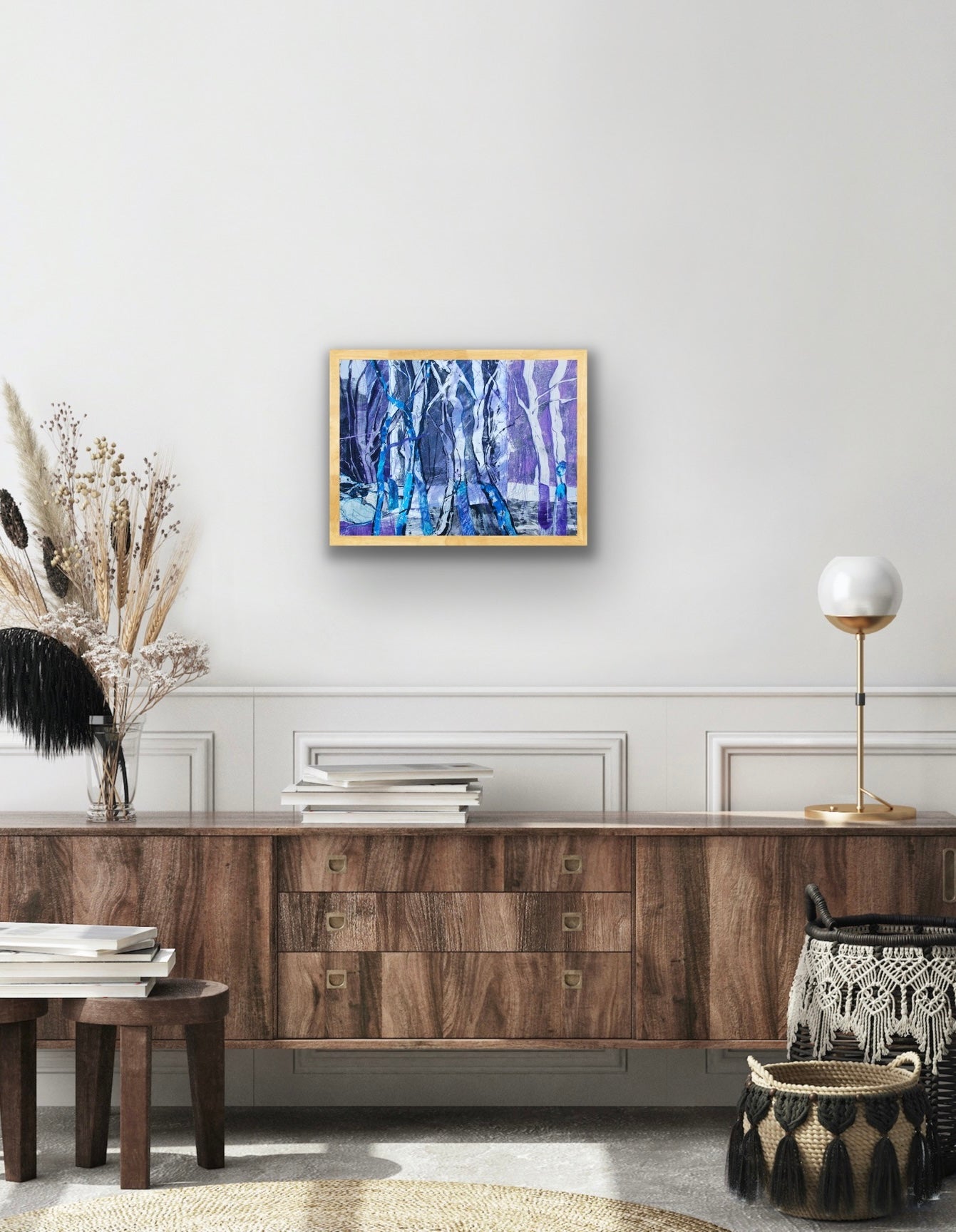 This piece invites you into an enchanting forest created by hand-printing on silk with a palette of vibrant purples and blues, juxtaposed with stark blacks. The color contrasts evoke a sense of twilight mystery, where the boundaries between reality and imagination are blurred. Machine stitching adds both texture and dimension, with threads intricately tracing the distinct contours of branches. I beckon you to step into this otherworldly forest, where every moment feels timeless.