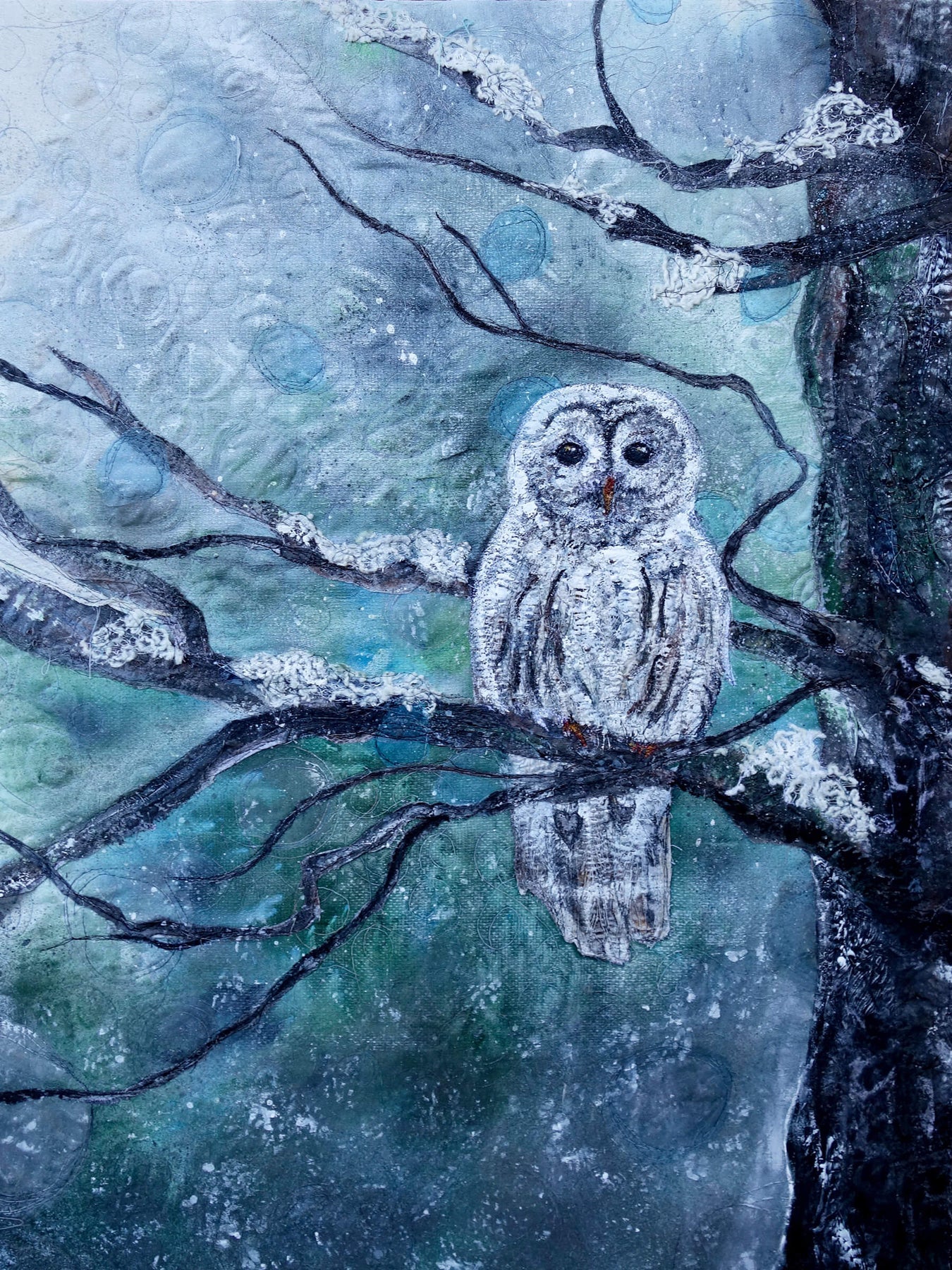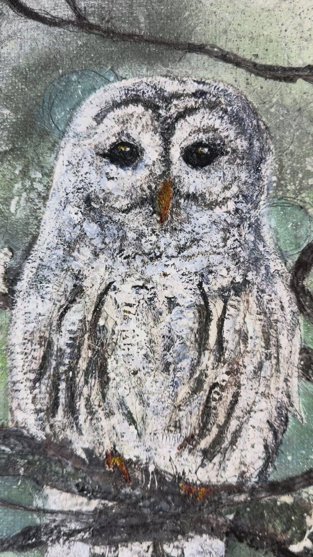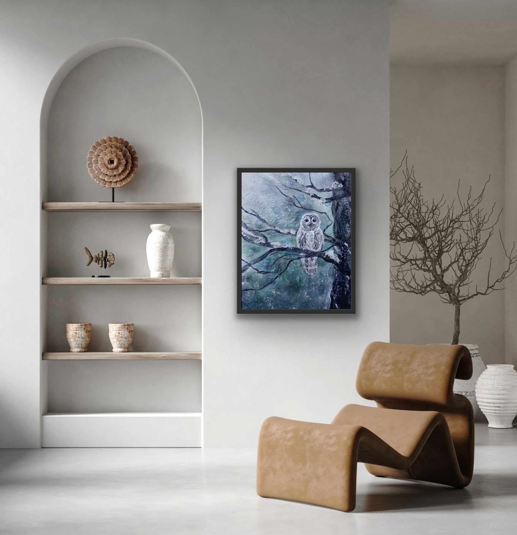 In the hush of winter, a barred owl keeps watch among drifting snow. Its stillness feels ancient, the air around it thick with listening. Light gathers softly on the branch, and for a moment, time folds into quiet grace, a meditation in feather and frost.