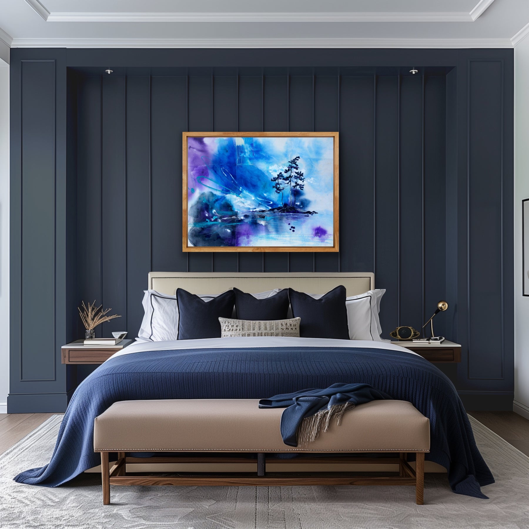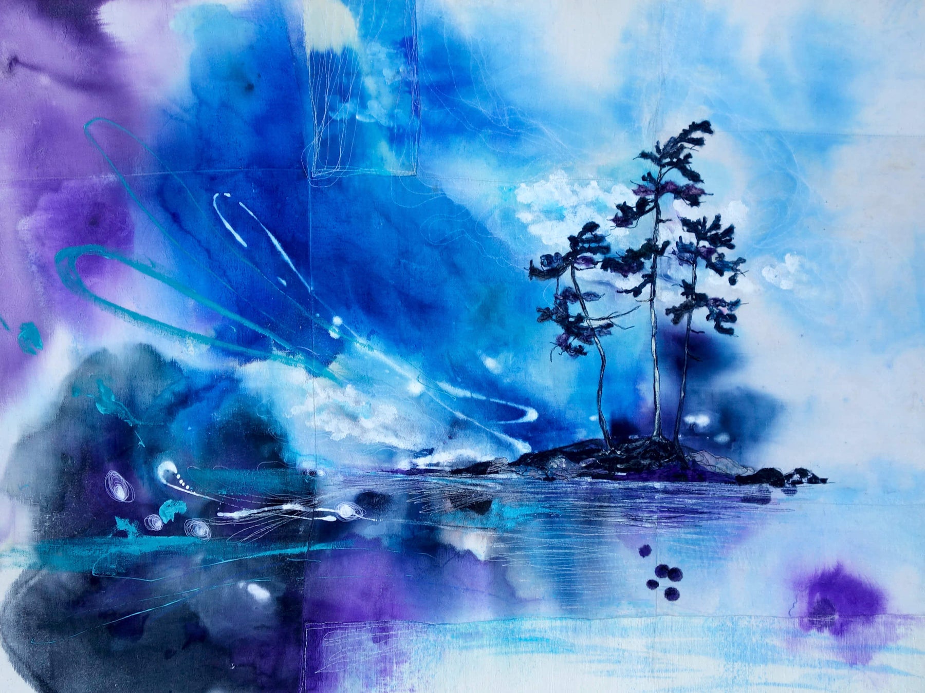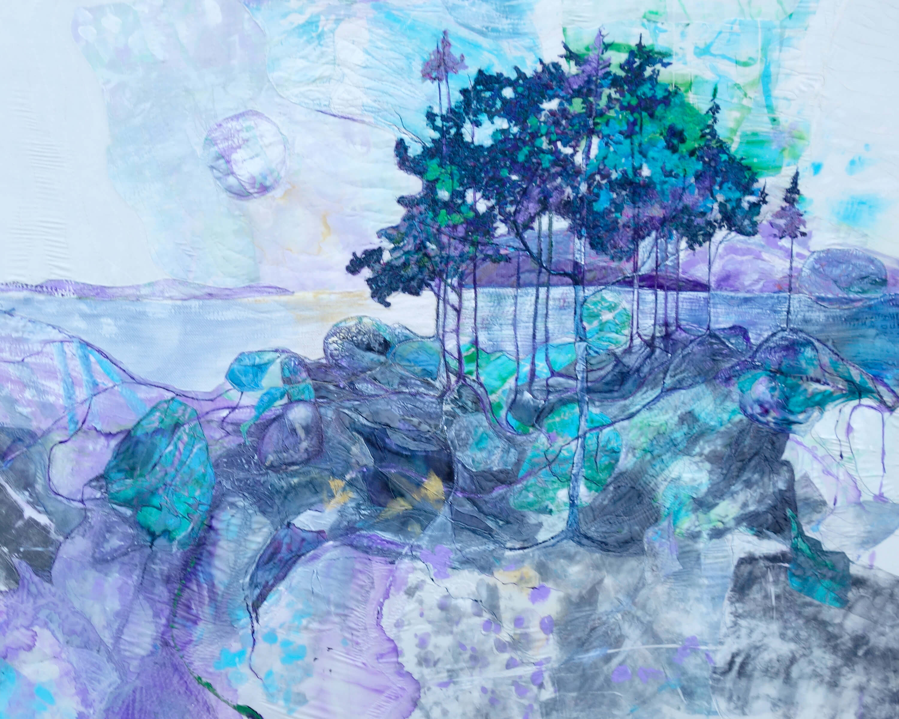 In a field of hand dyed colour, trees begin to appear against a dark purple sky, quiet and almost otherworldly. Soft blends of paint, wool, and stitch lift their forms into view, as if carried forward by light itself. A moment of gentle rising, where the landscape feels both mysterious and newly awakened.
