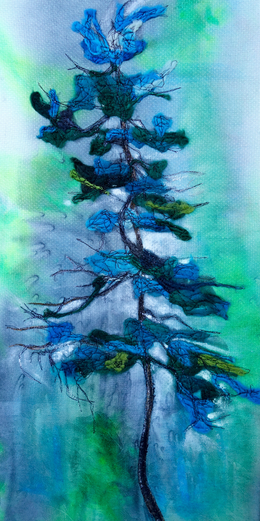 A single white pine stands alone, rising with quiet determination. Its form reaches upward through soft layers of colour and wool, anchored yet striving, holding both solitude and strength in its gentle ascent.
