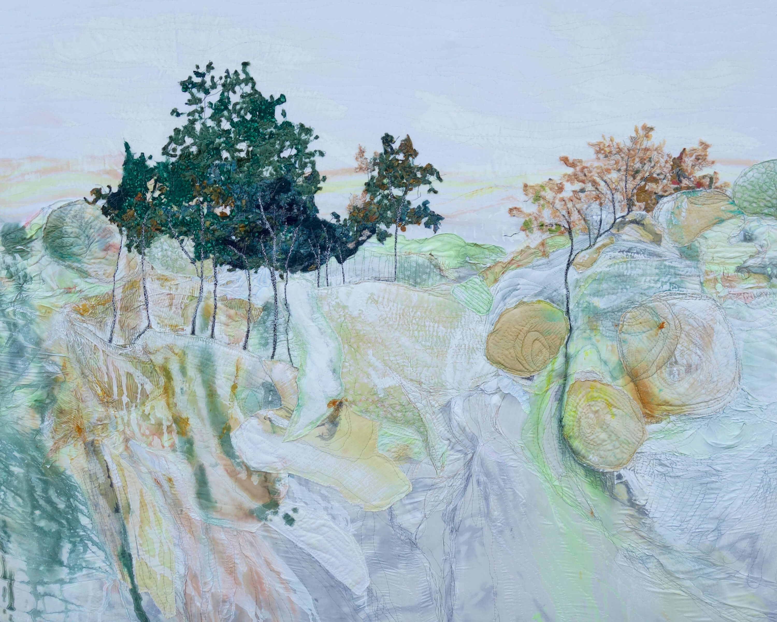 Medium: Dyed and stitched silk pieces, merino wool and hand printed material
