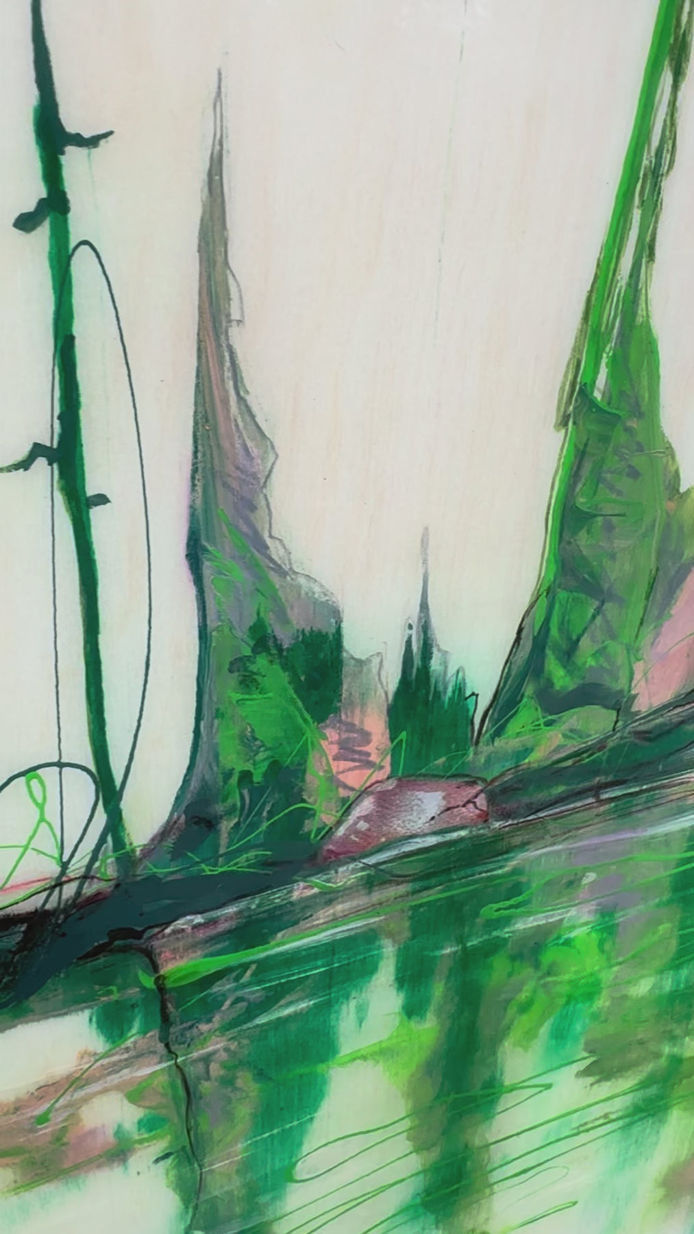 Soft greens and pinks merge in quiet symmetry. The surface of the water gathers light and shadow until they are one, an echo of stillness that invites the viewer to linger.