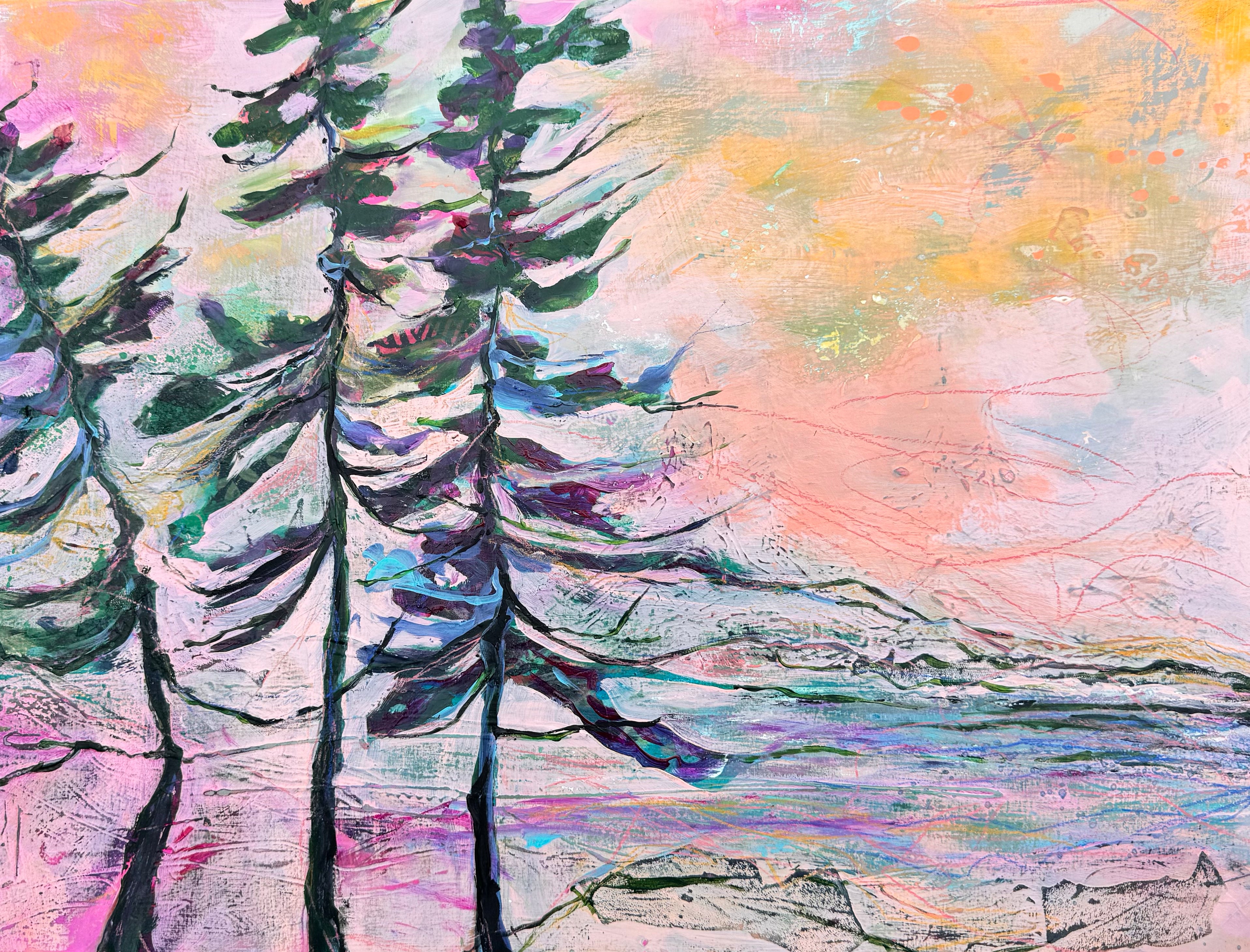 Texture and colour move in long, confident gestures as an implied tree anchors the composition. It feels both grounded and ascending, a contemporary study in strength without noise.